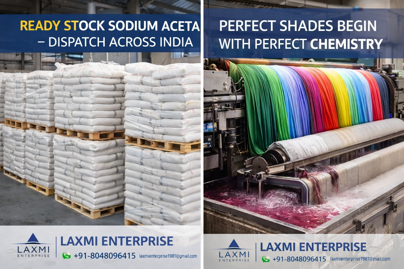 Laxmi Enterprise, Vadodara supplies textile-grade sodium acetate trusted by mills for reliability and repeat performance. Available in bulk packaging, our product integrates smoothly into modern dyeing and printing operations.